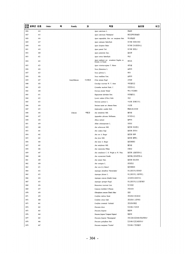 304 전체 번호 분류군 번호 Order 목 Family 과 학명 일반명 비고 1026 614 Agave americana L. 용설란 1027 615 Agave americana Mediopicta메디오픽타용설란 1028 616 Agave angustifolia. Haw. var. marginata Hort. 무늬용설란 1029 617 Agave attenuata Salm-Dyck 아가베 아테누아타 1030 618 Agave decipiens Baker 아가베 디시피엔시스 1031 619 Agave patonii Trel. 아가베 파토니 1032 620 Agave potatorum Zucc. 길상관 1033 621 Agave stricta Salm-Dyck 취상 1034 622 Agave utahensis...