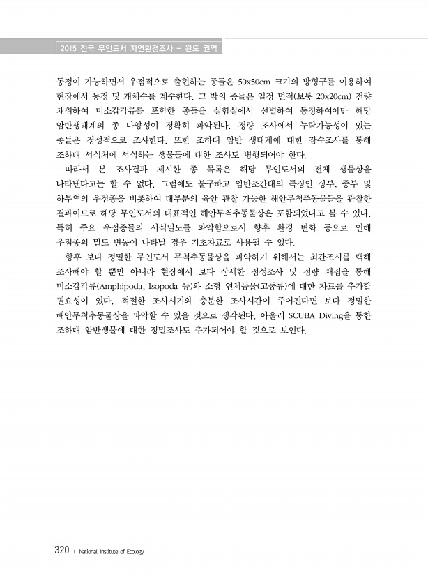 2015 전국 무인도서 자연환경조사 완도 권역 320 ? National Institute of Ecology 동정이 가능하면서 우점적으로 출현하는 종들은 50x50cm 크기의 방형구를 이용하여 현장에서 동정 및 개체수를 계수한다. 그 밖의 종들은 일정 면적 보통 20x20cm 전량 채취하여 미소갑각류를 포함한 종들을 실험실에서 선별하여 동정하여야만 해당 암반생태계의 종 다양성이 정확히 파악된다. 정량 조사에서 누락가능성이 있는 종들은 정성적으로 조사한다. 또한 조하대 암반 생태계에 대한 잠수조사를 통해 조하대 서식처에 서식하는 생물들에 대한 조사도 병행되어야 한다. 따라서 본 조사결과 제시한 종 목록은 해당 무인도서의 전체 생물상을 나타낸다고는 할 수 없다. 그럼에도 불구하고 암반조간대의 특징인 상부, 중...