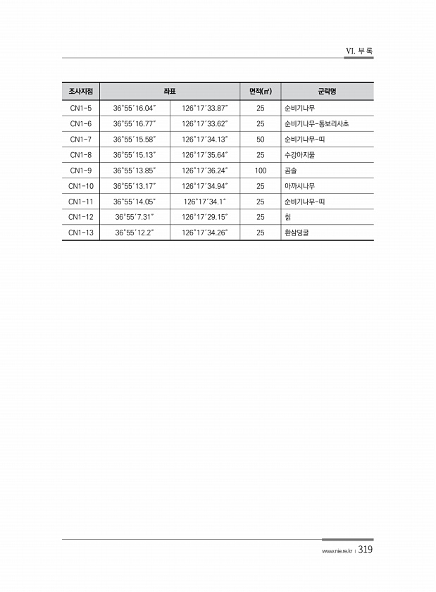 VI. 부 록 www.nie.re.kr ?319 조사지점 좌표 면적 ㎡ 군락명 CN1-5 36°55′16.04″ 126°17′33.87″ 25 순비기나무 CN1-6 36°55′16.77″ 126°17′33.62″ 25 순비기나무-통보리사초 CN1-7 36°55′15.58″ 126°17′34.13″ 50 순비기나무-띠 CN1-8 36°55′15.13″ 126°17′35.64″ 25 수강아지풀 CN1-9 36°55′13.85″ 126°17′36.24″ 100 곰솔 CN1-10 36°55′13.17″ 126°17′34.94″ 25 아까시나무 CN1-11 36°55′14.05″ 126°17′34.1″ 25 순비기나무-띠 CN1-12 36°55′7.31″ 126°17′29.15″ 25 칡 CN1-13 36°55′12...