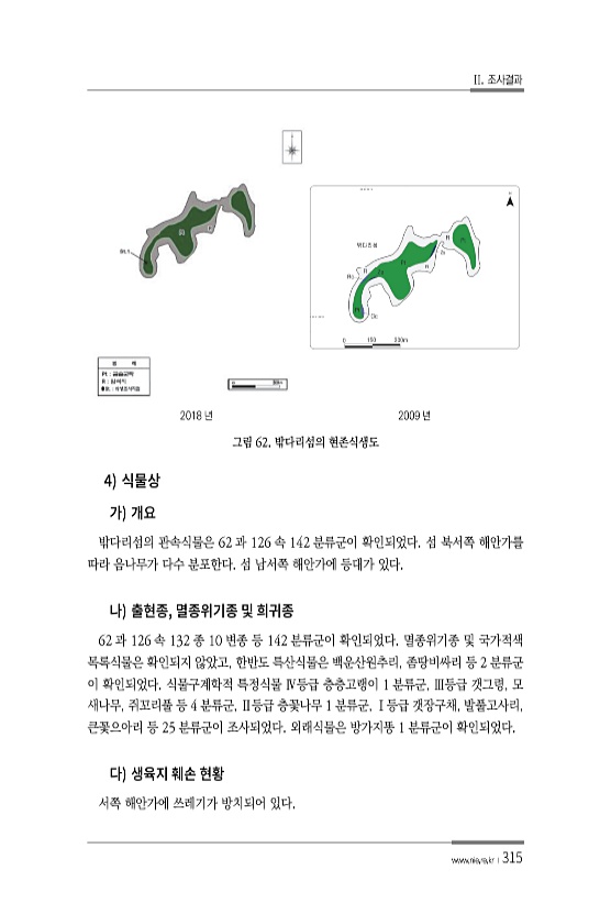 II. 조사결과 www.nie.re.kr ?315 2018 년 2009 년 그림 62. 밖다리섬의 현존식생도 4 밖다리섬의 관속식물은 62 과 126 속 142 분류군이 확인되었다. 섬 북서쪽 해안가를 따라 음나무가 다수 분포한다. 섬 남서쪽 해안가에 등대가 있다. , 62 과 126 속 132 종 10 변종 등 142 분류군이 확인되었다. 멸종위기종 및 국가적색 목록식물은 확인되지 않았고, 한반도 특산식물은 백운산원추리, 좀땅비싸리 등 2 분류군 이 확인되었다. 식물구계학적 특정식물 Ⅳ등급 층층고랭이 1 분류군, Ⅲ등급 갯그령, 모 새나무, 쥐꼬리풀 등 4 분류군, Ⅱ등급 층꽃나무 1 분류군, Ⅰ등급 갯장구채, 발풀고사리, 큰꽃으아리 등 25 분류군이 조사되었다. 외래식물은 방가지똥 1 분류군이 확인되었다...