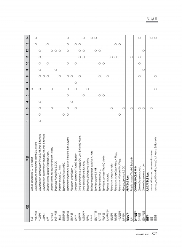 321 국명 학명 1 2 3 4 5 6 7 8 9 10 11 12 13 14 망초 Conyza canadensis L. Cronquist ○ 주홍서나물 Crassocephalum crepidioides Benth. S. Moore ○ ○ 이고들빼기 Crepidiastrum denticulatum Houtt. J.H. Pak & Kawano ○ ○ ○ ○ ○ ○ ○ ○ ○ ○ 고들빼기 Crepidiastrum sonchifolium Bunge J.H. Pak & Kawano ○ 산국 Dendranthema boreale Makino Kitam. ○ ○ ○ 산구절초 Dendranthema zawadskii Herbich Tzvelev ○ ○ ○ 붉은서나물 Erechtites hieracifolia L. DC. ...