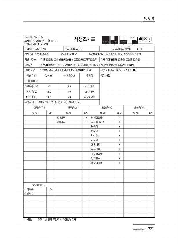 V. 부 록 www.nie.re.kr ?321 No 01 서근도 5 조사일자 2018 년 7 월 11 일 조사자이남주, 김갑식 식생조사표 군락명소사나무군락 조사지역서근도 도엽명 격자번호 식생상관낙엽활엽수림 면적8 × 8 ㎡ 위?경도 GPS 34°3812.08N, 127°4237.47E 해발10 m 지형□산정 □능선 ■사면 ■상□중□하 □계곡□평지 미세지형■평면 □돌출 □함몰 □요철 방위N 토양■갈색삼림토□적황색삼림토□암적색삼림토□회갈색삼림토□침식토□미숙토□암쇄토 경사20 ° 낙엽부식층 cm □.≥20 □ 15 □ 10 ■ 5 □0 암석노출 % □≥51□ 25□ 5■0 계층구분 높이 m 식피율 % 우점종 특기사항교 목 층 T1 아교목층 T2 6 95 소사나무 관 목 층 S 2.0 10 소사나무 초 본 층 H ...