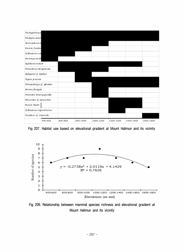 Fig 207. Habitat use based on elevational gradient at Mount Halimun and its vicinity Fig 208. Relationship between mammal species richness and elevational gradient at Mount Halimun and its vicinity 297