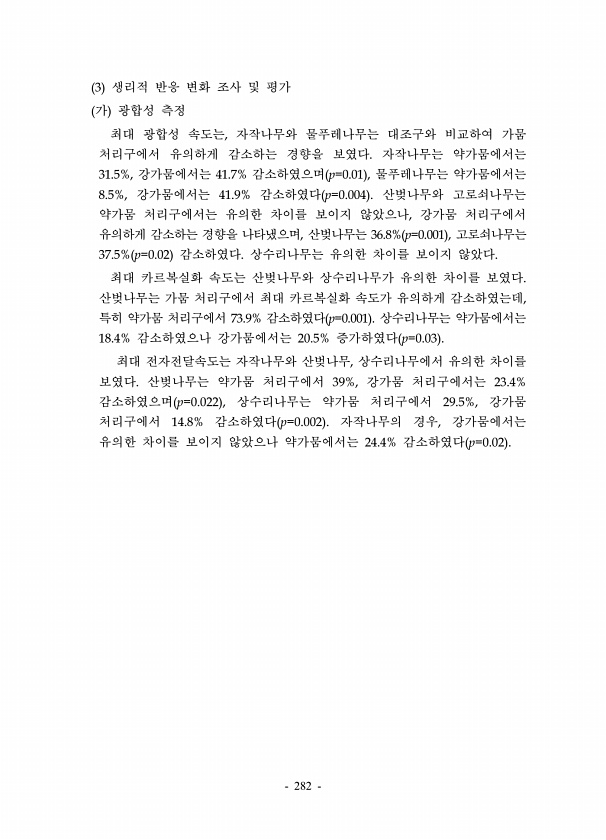 282 3 생리적 반응 변화 조사 및 평가 가 광합성 측정 최대 광합성 속도는, 자작나무와 물푸레나무는 대조구와 비교하여 가뭄 처리구에서 유의하게 감소하는 경향을 보였다. 자작나무는 약가뭄에서는 31.5%, 강가뭄에서는 41.7% 감소하였으며 p=0.01 , 물푸레나무는 약가뭄에서는 8.5%, 강가뭄에서는 41.9% 감소하였다 p=0.004 산벚나무와 고로쇠나무는 약가뭄 처리구에서는 유의한 차이를 보이지 않았으나, 강가뭄 처리구에서 유의하게 감소하는 경향을 나타냈으며, 산벚나무는 36.8% p=0.001 , 고로쇠나무는 37.5% p=0.02 감소하였다. 상수리나무는 유의한 차이를 보이지 않았다. 최대 카르복실화 속도는 산벚나무와 상수리나무가 유의한 차이를 보였다. 산벚나무는 가뭄 처리구에서 최대 카르복실화...
