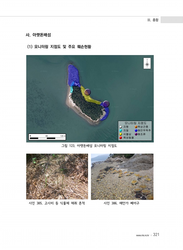 Ⅲ. 종합 www.nie.re.kr ? 321 사. 아랫돈배섬 1 모니터링 지점도 및 주요 훼손현황 그림 123. 아랫돈배섬 모니터링 지점도 사진 385. 고사리 등 식물체 채취 흔적 사진 386. 해안가폐어구