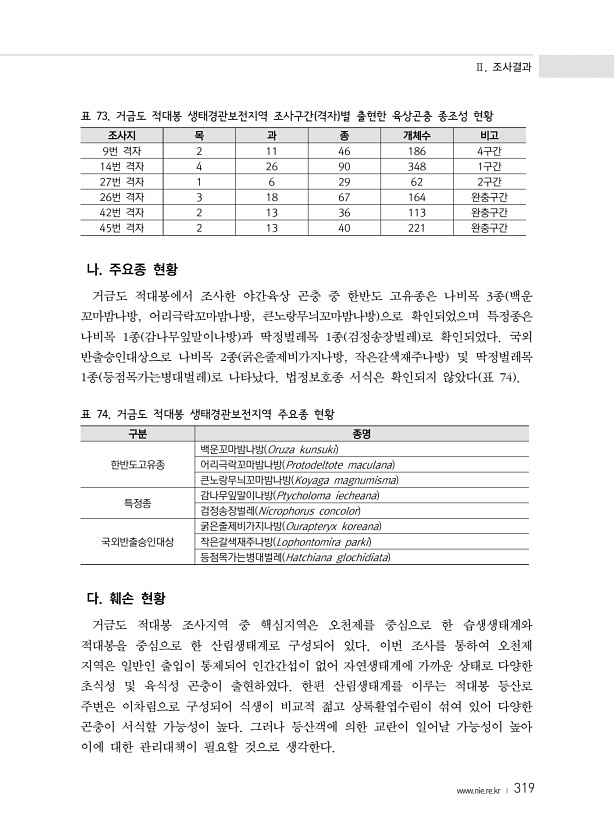Ⅱ. 조사결과 www.nie.re.kr ? 319 표 73. 거금도 적대봉 생태경관보전지역 조사구간 격자 별 출현한 육상곤충 종조성 현황 조사지 목 과 종 개체수 비고 9번 격자 2 11 46 186 4구간 14번 격자 4 26 90 348 1구간 27번 격자 1 6 29 62 2구간 26번 격자 3 18 67 164 완충구간 42번 격자 2 13 36 113 완충구간 45번 격자 2 13 40 221 완충구간 나. 주요종 현황 거금도 적대봉에서 조사한 야간육상 곤충 중 한반도 고유종은 나비목 3종 백운 꼬마밤나방, 어리극락꼬마밤나방, 큰노랑무늬꼬마밤나방 으로 확인되었으며 특정종은 나비목 1종 감나무잎말이나방 과 딱정벌레목 1종 검정송장벌레 로 확인되었다. 국외 반출승인대상으로 나비목 2종 굵은줄제비가지나방...