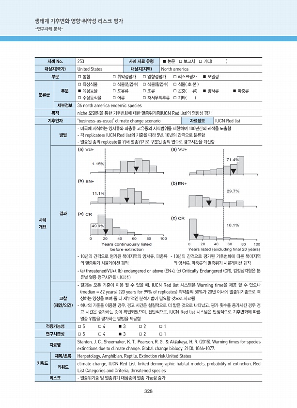 328 생태계 기후변화 영향·취약성·리스크 평가 -연구사례 분석- 사례 No. 253 사례 자료 유형 ■ 논문 □ 보고서 □ 기타 대상지 국가 United States 대상지 지역 North america 부문 □ 통합 □ 취약성평가 □ 영향성평가 □ 리스크평가 ■ 모델링 분류군 부문 □ 육상식물 □ 식물 침엽수 □ 식물 활엽수 □ 식물 초 본 ■ 육상동물 □ 포유류 □ 조류 □ 곤충 류 ■ 양서류 ■ 파충류 □ 수상동식물 □ 어류 □ 저서무척추류 □ 기타 세부정보 36 north america endemic species 목적 niche 모델링을 통한 기후변화에 대한 멸종위기종 IUCN Red list 의 영향성 평가 기후인자 ‘‘business-as-usual’’ climate change scenari...