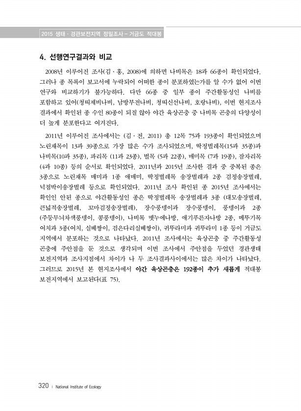 2015 생태·경관보전지역 정밀조사 거금도 적대봉 320 ? National Institute of Ecology 4. 선행연구결과와 비교 2008년 이루어진 조사 김·홍, 2008 에 의하면 나비목은 18과 66종이 확인되었다. 그러나 종 목록이 보고서에 누락되어 어떠한 종이 분포하였는가를 알 수가 없어 이번 연구와 비교하기가 불가능하다. 다만 66종 중 일부 종이 주간활동성인 나비를 포함하고 있어 청띠제비나비, 남방부전나비, 청띠신선나비, 호랑나비 , 이번 현지조사 결과에서 확인된 종 수인 80종이 되질 않아 야간 육상곤충 중 나비목 곤충의 다양성이 더 높게 분포한다고 여겨진다. 2011년 이루어진 조사에서는 김·전, 2011 총 12목 75과 193종이 확인되었으며 노린재목이 13과 39종으로 가장 많...