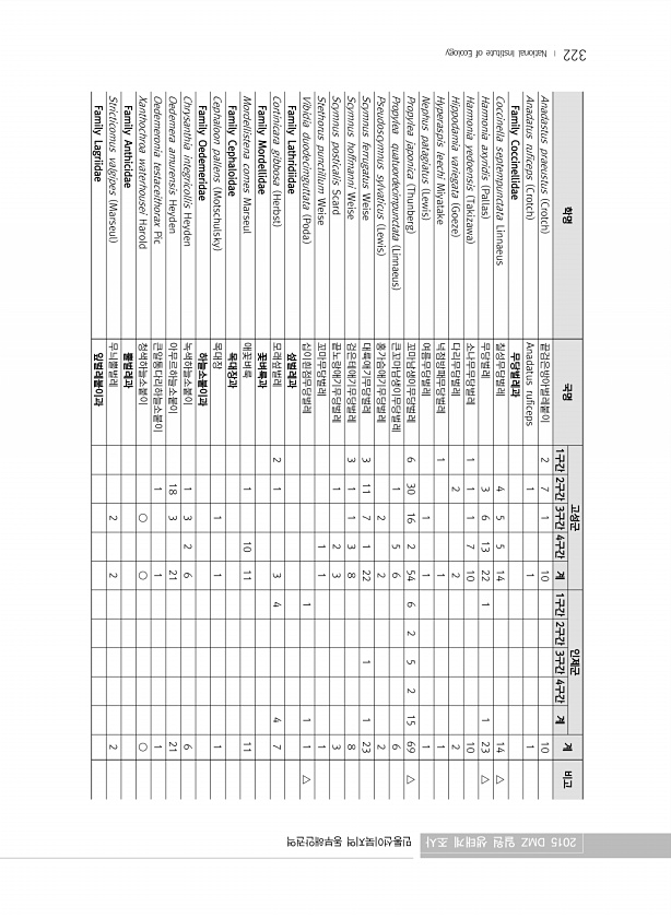 322 학명 국명 고성군 인제군 계 비고 1구간 2구간 3구간 4구간 계 1구간 2구간 3구간 4구간 계 Anadastus praeustus Crotch 끝검은방아벌레붙이 2 7 1 10 10 Anadatus ruficeps Crotch Anadatus ruficeps 1 1 1 Family Coccinellidae 무당벌레과 Coccinella septempunctata Linnaeus 칠성무당벌레 4 5 5 14 14 △ Harmonia axyridis Pallas 무당벌레 3 6 13 22 1 1 23 △ Harmonia yedoensis Takizawa 소나무무당벌레 1 1 1 7 10 10 Hippodamia variegata Goeze 다리무당벌레 2 2 2 Hyperaspis leechi Miy...