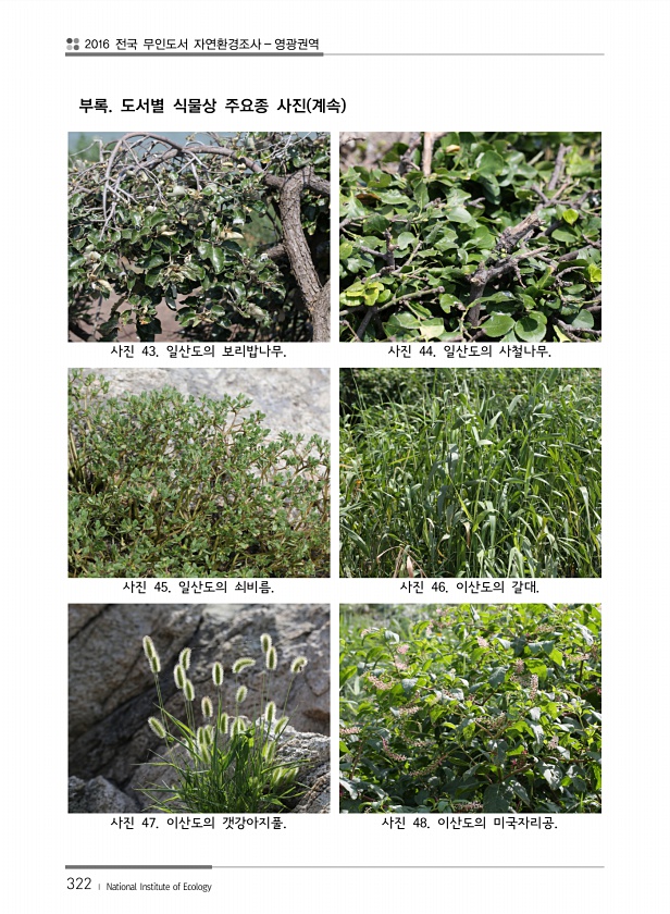 2016 전국 무인도서 자연환경조사 영광권역 322 ? National Institute of Ecology 부록. 도서별 식물상 주요종 사진 계속 사진 43. 일산도의 보리밥나무. 사진 44. 일산도의 사철나무. 사진 45. 일산도의 쇠비름. 사진 46. 이산도의 갈대. 사진 47. 이산도의 갯강아지풀. 사진 48. 이산도의미국자리공.