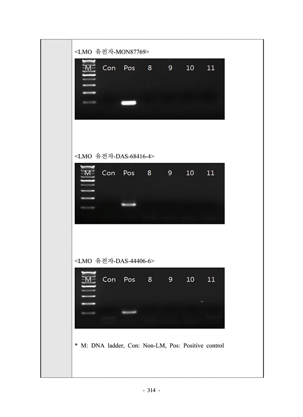 314 LMO 유전자-MON87769 LMO 유전자-DAS-68416-4 LMO 유전자-DAS-44406-6 * MDNA ladder, ConNon-LM, PosPositivecontrol