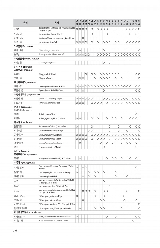 328 산철쭉 Rhododendron yedoense for. poukhanense H. Lev. M. Sugim. ○ ○ ○ ○ ○ ○ ○ ○ ○ ○ ○ ○ ○ ○ ○ ○ ○ ○ ○ 모새나무 Vaccinium bracteatum Thunb. ○ ○ ○ ○ ○ 산앵도나무 Vaccinium hirtum var. koreanum Nakai Kitam. ○ 정금나무 Vaccinium oldhamii Miq. ○ ○ ○ ○ ○ ○ ○ ○ ○ ○ ○ ○ ○ ○ ○ ○ 노루발과 Pyrolaceae 매화노루발 Chimaphila japonica Miq. ○ ○ ○ 노루발 Pyrola japonica Klenze ex Alef. ○ ○ ○ ○ ○ ○ ○ ○ ○ ○ ○ ○ ○ ○ ○ ○ ○ ○ ○ 수정난풀과 Monotrop...