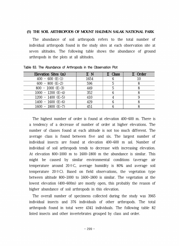 5 THE SOIL ARTHROPODS OF MOUNT HALIMUN SALAK NATIONAL PARK The abundance of soil arthropods refers to the total number of individual arthropods found in the study sites at each observation site at seven altitudes. The following table shows the abundance of ground arthropods in the plots at all altitudes. Elevation Sites m ∑ N ∑ Class ∑ Order 400 ? 600 E-1 1654 6 10 600 ? 800 E-2 596 5 8 800 ? 1000...