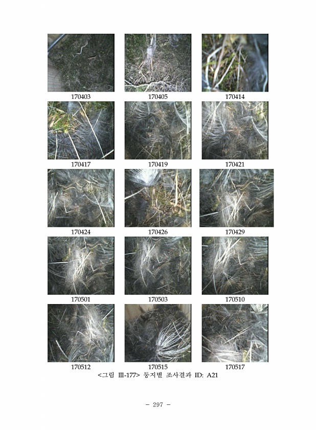 297 170403 170405 170414 170417 170419 170421 170424 170426 170429 170501 170503 170510 170512 170515 170517 그림 Ⅲ-177 둥지별 조사결과 IDA21