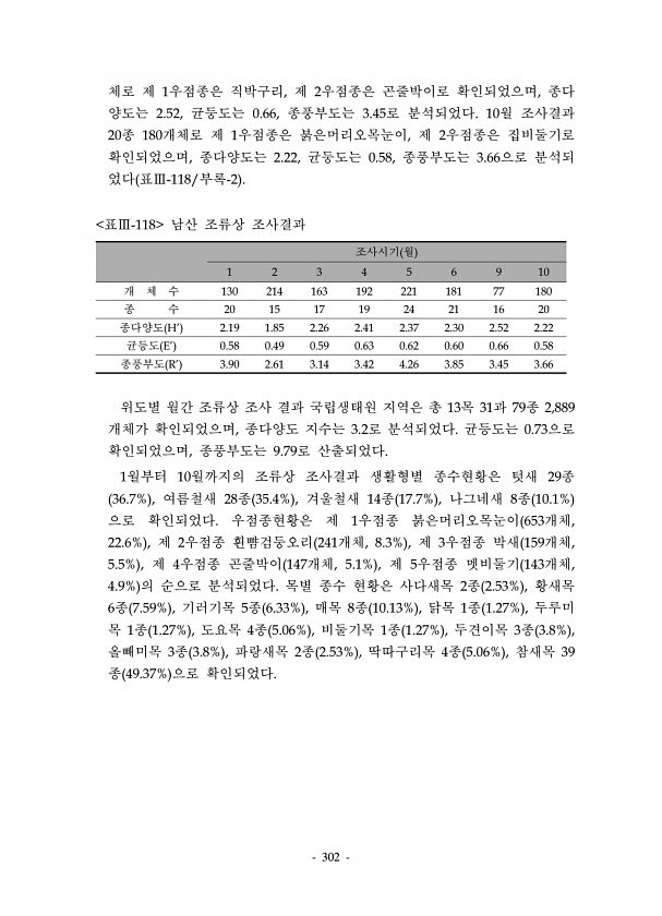 302 조사시기 월 1 2 3 4 5 6 9 10 개 체 수 130 214 163 192 221 181 77 180 종 수 20 15 17 19 24 21 16 20 종다양도 H2.19 1.85 2.26 2.41 2.37 2.30 2.52 2.22 균등도 E0.58 0.49 0.59 0.63 0.62 0.60 0.66 0.58 종풍부도 R3.90 2.61 3.14 3.42 4.26 3.85 3.45 3.66 표Ⅲ-118 남산 조류상 조사결과 체로 제 1우점종은 직박구리, 제 2우점종은 곤줄박이로 확인되었으며, 종다 양도는 2.52, 균둥도는 0.66, 종풍부도는 3.45로 분석되었다. 10월 조사결과 20종 180개체로 제 1우점종은 붉은머리오목눈이, 제 2우점종은 집비둘기로 확인되었으며, 종다양도는 2.2...