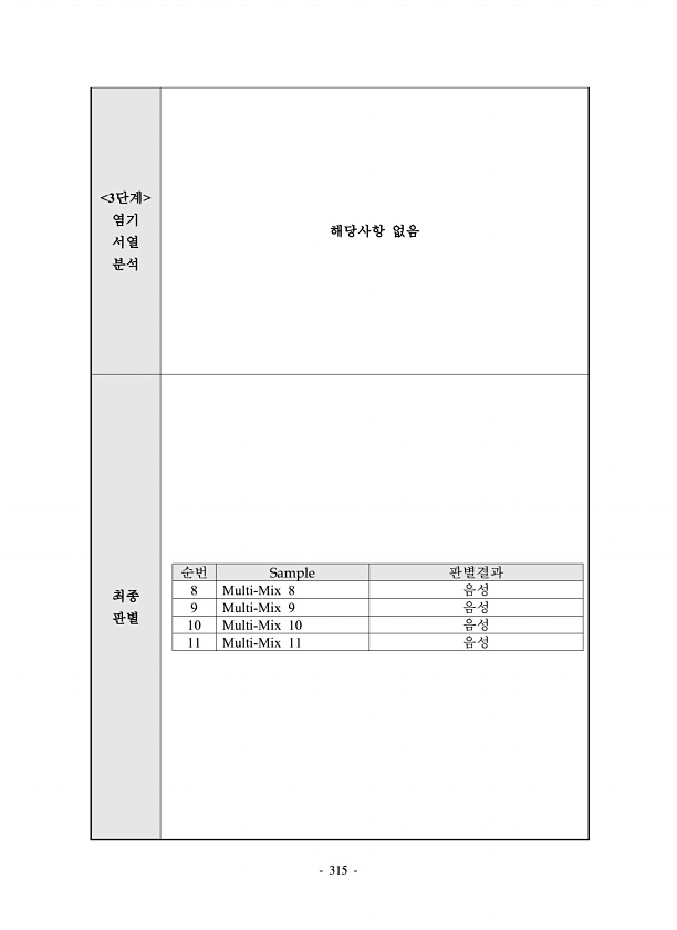 315 3단계 염기 서열 분석 해당사항 없음 최종 판별 순번 Sample 판별결과 8 Multi-Mix 8 음성 9 Multi-Mix 9 음성 10 Multi-Mix 10 음성 11 Multi-Mix 11음성