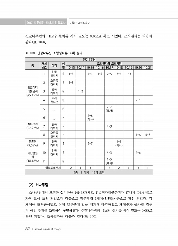 2017 백두대간 생태계 정밀조사 구룡산 고정조사구 324 ? National Institute of Ecology 신갈나무림의 1㎢당 설치류 서식 밀도는 0.053로 확인 되었다. 조사결과는 다음과 같다 표 108 신갈나무림 종 개체 번호 마킹 성 별 10.13 10.14 10.15 10.16 포획일자와 포획지점 10.17 10.18 10.19 10.20 10.21 흰넓적다 리붉은쥐 45.45% 1 왼쪽 허벅지 ♀ 1-4 1-1 3-4 2-5 3-4 1-3 2 오른쪽 허벅지 ♀ 5-5 3 양쪽 허벅지 ♀ 1-2 4 꼬리 윗부분 ♂ 7-1 5 ♂ 7-7 폐사 작은땃쥐 27.27% 6 1-6 폐사 7 왼쪽 허벅지 4-3 8 오른쪽 허벅지 1-6 4-3 등줄쥐 9.09% 9 허벅지 왼쪽 ♂ 2-7 폐사 1-1 ...