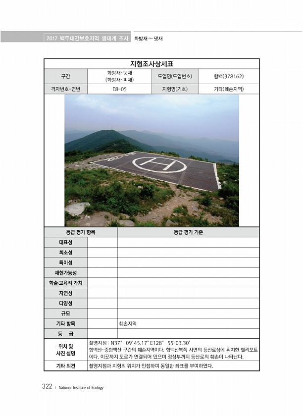 2017 백두대간보호지역 생태계 조사 화방재 댓재 322 ? National Institute of Ecology 지형조사상세표 구간 화방재댓재 화방재피재 도엽명 도엽번호 함백 378162 격자번호-연번 E8-05 지형명 기호 기타 훼손지역 등급 평가 항목 등급 평가 기준 대표성 희소성 특이성 재현가능성 학술?교육적 가치 자연성 다양성 규모 기타 항목 훼손지역 등 급 위치 및 사진 설명 촬영지점 N37° 0945.17E128° 5503.30함백산중함백산 구간의 훼손지역이다. 함백산북쪽 사면의 등산로상에 위치한 헬리포트 이다. 이곳까지 도로가 연결되어 있으며 정상부까지 등산로의 훼손이 나타난다. 기타 의견 촬영지점과 지형의 위치가 인접하여 동일한 좌표를부여하였다.