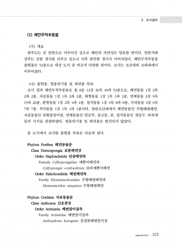 Ⅱ. 조사결과 www.nie.re.kr ? 323 5 해안무척추동물 가 개요 광주도는 큰 암반으로 이루어진 섬으로 해안의 자연성은 양호한 편이다. 암반지대 상부는 급한 경사를 이루고 있으나 이후 완만한 경사가 이어져있다. 해안무척추동물 출현종은 52종으로 대상 도서 중 비교적 다양한 편이다. 조사는 조간대와 조하대에서 이루어졌다. 나 출현종, 멸종위기종 및 희귀종 목록 조사 결과 해안무척추동물은 총 8문 13강 26목 40과 52종으로, 해면동물 1강 2목 2과 2종, 자포동물 1강 1목 2과 2종, 태형동물 1강 1목 1과 2종, 연체동물 3강 9목 15과 26종, 환형동물 1강 2목 4과 4종, 절지동물 1강 4목 8과 8종, 극피동물 4강 6목 7과 7종, 척삭동물 1강 1목 1과 1종이다. 암반조간대...
