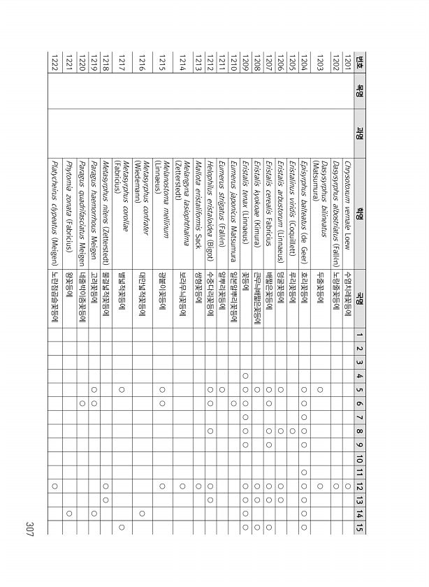 307 번호 목명 과명 학명 국명 1 2 3 4 5 6 7 8 9 10 11 12 13 14 15 1201 Chrysotoxum vernale Loew 수염치레꽃등에 ○ 1202 Dasysyrphus albostriatus Fall?n 노랑줄꽃등에 ○ 1203 Dasysyrphus bilineatus Matsumura 두줄꽃등에 ○ ○ 1204 Episyrphus balteatus de Geer 호리꽃등에 ○ ○ ○ ○ ○ ○ ○ ○ ○ ○ 1205 Eristalinus viridis Coquillett 루리꽃등에 ○ 1206 Eristalis arbustorum Linnaeus 덩굴꽃등에 ○ ○ ○ ○ 1207 Eristalis cerealis Fabricius 배짧은꽃등에 ○ ○ ○ ○ ○ ○ ○ 120...