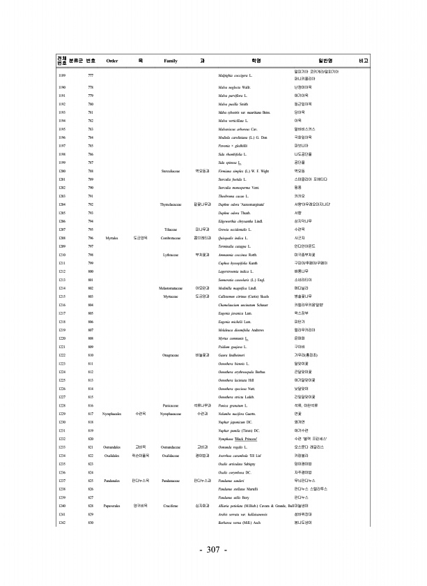 307 전체 번호 분류군 번호 Order 목 Family 과 학명 일반명 비고 1189 777 Malpighia coccigera L. 말피기아 코키게라/말피기아 퍼니키폴리아 1190 778 Malva neglecta Wallr. 난쟁이아욱 1191 779 Malva parviflora L. 애기아욱 1192 780 Malva pusilla Smith 둥근잎아욱 1193 781 Malva sylvestris var. mauritiana Boiss. 당아욱 1194 782 Malva verticillata L. 아욱 1195 783 Malvaviscus arboreus Cav. 말바비스커스 1196 784 Modiola caroliniana L. G. Don 국화잎아욱 1197 785 Pavonia × gle...