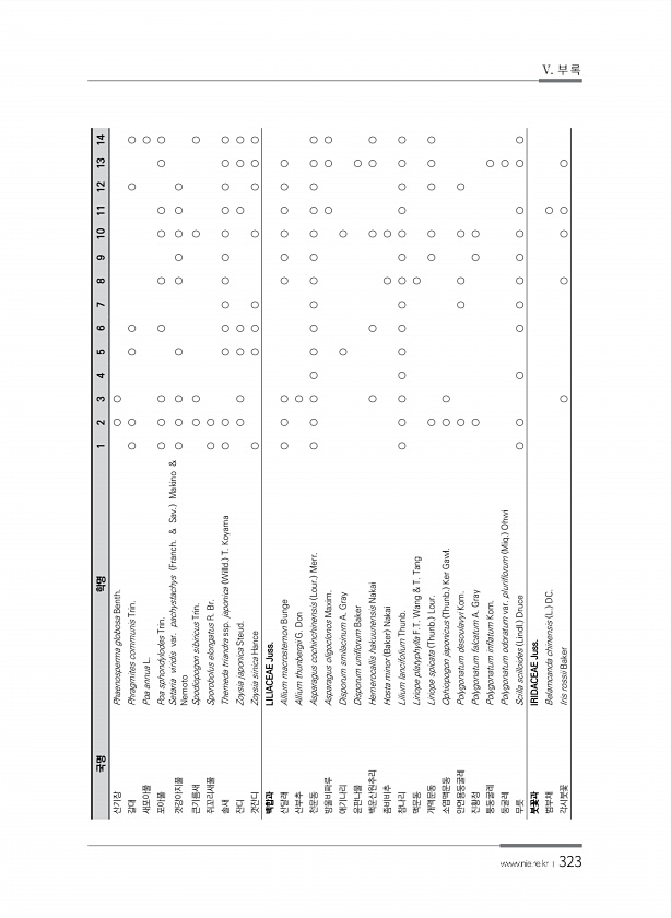 323 국명 학명 1 2 3 4 5 6 7 8 9 10 11 12 13 14 산기장 Phaenosperma globosa Benth. ○ ○ 갈대 Phragmites communis Trin. ○ ○ ○ ○ ○ ○ 새포아풀 Poa annua L. ○ 포아풀 Poa sphondylodes Trin. ○ ○ ○ ○ ○ ○ ○ ○ ○ 갯강아지풀 Setaria viridis var. pachystachys Franch. & Sav. Makino & Nemoto ○ ○ ○ ○ ○ ○ ○ ○ ○ 큰기름새 Spodiopogon sibiricus Trin. ○ ○ ○ ○ 쥐꼬리새풀 Sporobolus elongatus R. Br. ○ ○ 솔새 Themeda triandra ssp. japonica Willd. T. Koy...