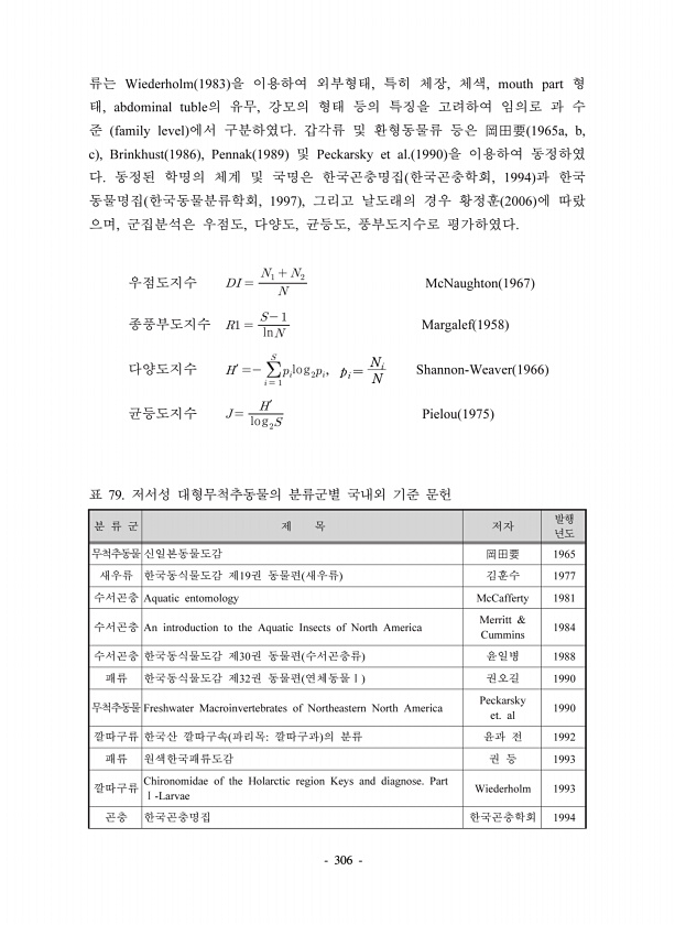 306 Wiederholm 1983 , , , mouth part , abdominal tuble , family level 岡田要 1965a, b, c , Brinkhust 1986 , Pennak 1989 Peckarsky et al. 1990 , 1994 , 1997 , 2006 , , , , McNaughton 1967 Margalef 1958 , p i= N i N Shannon-Weaver 1966 Pielou 1975 79. 岡田要 1965 19 1977 Aquatic entomology McCafferty 1981 An introduction to the Aquatic Insects of North America Merritt & Cummins 1984 30 1988 32 1990 Freshw...
