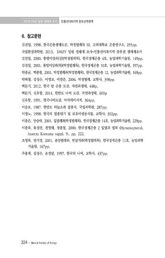 2018 DMZ 일원 생태계 조사 민통선이북지역 중부산악권역 324 ? National Institute of Ecology 6. 참고문헌 김진일, 1998. 한국곤충생태도감, 딱정벌레목 III. 고려대학교 곤충연구소, 255pp. 국립환경과학원, 2013, DMZV 일원 생태계 조사-민통선이북지역 중부권 생태계조사 김진일, 2000. 풍뎅이상과 상 딱정벌레목 한국경제곤충 4호, 농업과학기술원, 149pp. 김진일, 2001. 풍뎅이상과 하 딱정벌레목 한국경제곤충 10호, 농업과학기술원, 197pp. 박종균, 백종철, 2001. 딱정벌레과 딱정벌레목 한국경제곤충 12, 농업과학기술원, 169pp. 박해철, 김성수, 이영보, 이영준, 2006. 딱정벌레. 교학사, 358pp. 백문기, 2012. 한국 밤 곤충...