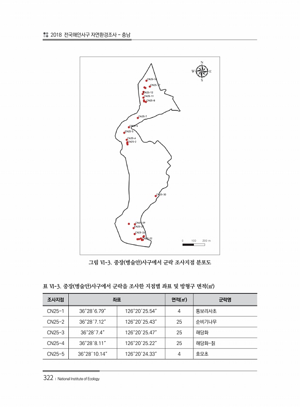 2018 전국해안사구 자연환경조사 충남 322 ? National Institute of Ecology 그림 Ⅵ-3. 중장 병술안 사구에서 군락 조사지점 분포도 조사지점 좌표 면적 ㎡ 군락명 CN25-1 36°28′6.79″ 126°20′25.54″ 4 통보리사초 CN25-2 36°28′7.12″ 126°20′25.43″ 25 순비기나무 CN25-3 36°28′7.4″ 126°20′25.47″ 25 해당화 CN25-4 36°28′8.11″ 126°20′25.22″ 25 해당화-칡 CN25-5 36°28′10.14″ 126°20′24.33″ 4 호모초 표 Ⅵ-3. 중장 병술안 사구에서 군락을 조사한 지점별 좌표 및 방형구 면적 ㎡