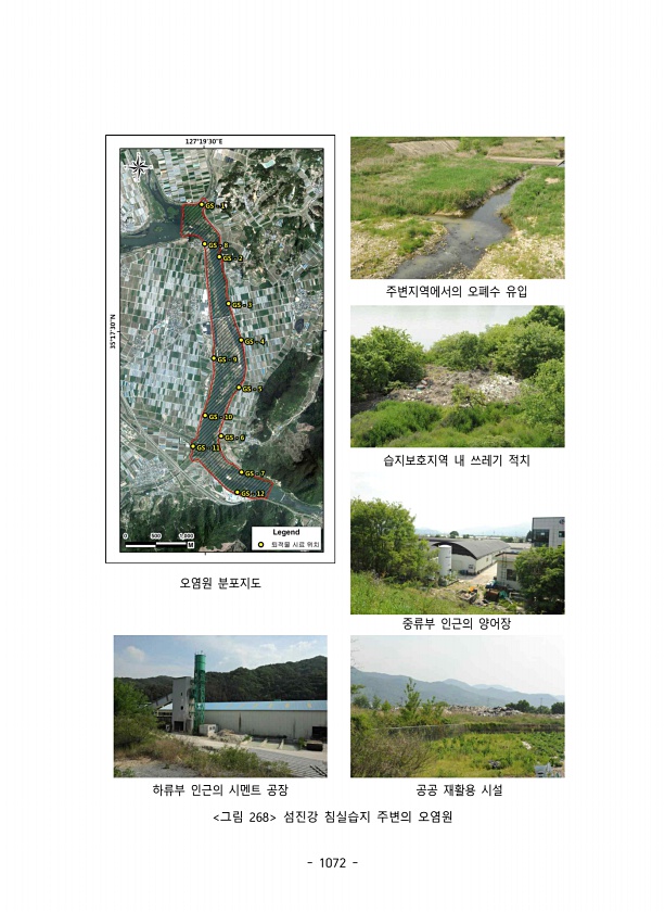 1072 주변지역에서의 오폐수 유입 습지보호지역 내 쓰레기 적치 오염원 분포지도 중류부 인근의 양어장 하류부 인근의 시멘트 공장 공공 재활용 시설 그림 268 섬진강 침실습지 주변의오염원