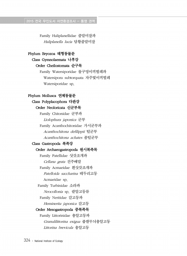 2015 전국 무인도서 자연환경조사 통영 권역 324 ? National Institute of Ecology Family Haliplanellidae 줄말미잘과 Haliplanella lucia 담황줄말미잘 Phylum Bryozoa 태형동물문 Class Gymnolaemata 나후강 Order Cheilostomata 순구목 Family Watersiporidae 물구멍이끼벌레과 Watersipora subtorquata 자주빛이끼벌레 Watersiporidae sp. Phylum Mollusca 연체동물문 Class Polyplacophora 다판강 Order Neoloricata 신군부목 Family Chitonidae 군부과 Liolophura japonica 군부 Family Acanthochit...