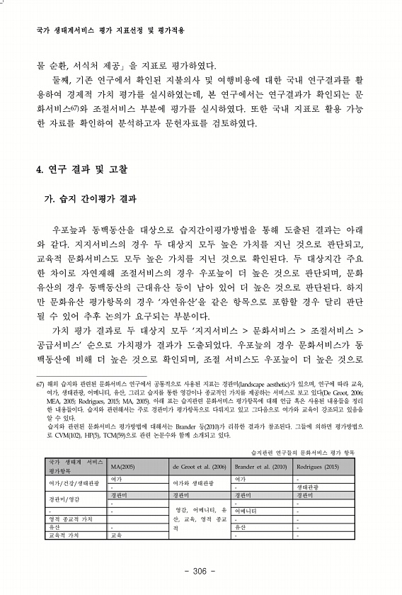 국가 생태계서비스 평가 지표선정 및 평가적용 306 물 순환, 서식처 제공」을 지표로 평가하였다. 둘째, 기존 연구에서 확인된 지불의사 및 여행비용에 대한 국내 연구결과를 활 용하여 경제적 가치 평가를 실시하였는데, 본 연구에서는 연구결과가 확인되는 문 화서비스67 와 조절서비스 부분에 평가를 실시하였다. 또한 국내 지표로 활용 가능 한 자료를 확인하여 분석하고자 문헌자료를 검토하였다. 4. 연구 결과 및 고찰 가. 습지 간이평가 결과 우포늪과 동백동산을 대상으로 습지간이평가방법을 통해 도출된 결과는 아래 와 같다. 지지서비스의 경우 두 대상지 모두 높은 가치를 지닌 것으로 판단되고, 교육적 문화서비스도 모두 높은 가치를 지닌 것으로 확인된다. 두 대상지간 주요 한 차이로 자연재해 조절서비스의 경우 우포늪이...