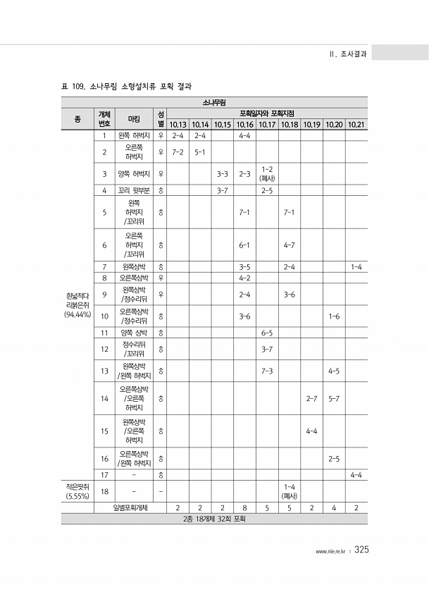 Ⅱ. 조사결과 www.nie.re.kr ? 325 소나무림 종 개체 번호 마킹 성 별 10.13 10.14 10.15 10.16 포획일자와 포획지점 10.17 10.18 10.19 10.20 10.21 흰넓적다 리붉은쥐 94.44% 1 왼쪽 허벅지 ♀ 2-4 2-4 4-4 2 오른쪽 허벅지 ♀ 7-2 5-1 3 양쪽 허벅지 ♀ 3-3 2-3 1-2 폐사 4 꼬리 윗부분 ♂ 3-7 2-5 5 왼쪽 허벅지 /꼬리위 ♂ 7-1 7-1 6 오른쪽 허벅지 /꼬리위 ♂ 6-1 4-7 7 왼쪽상박 ♂ 3-5 2-4 1-4 8 오른쪽상박 ♀ 4-2 9 왼쪽상박 /정수리뒤 ♀ 2-4 3-6 10 오른쪽상박 /정수리뒤 ♂ 3-6 1-6 11 양쪽 상박 ♂ 6-5 12 정수리뒤 /꼬리위 ♂ 3-7 13 왼쪽상박 /왼쪽 허벅지 ...