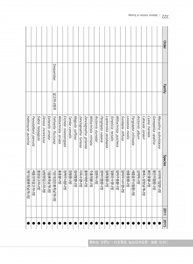 322 Order Family Species 2011 2015 Mecodina subviolacea 보라애기잎밤나방 ● Gonepatica opalina 붉은띠짤름나방 ● Cyana hamata 붉은줄불나방 ● Catocala jonasii 뾰족노랑뒷날개나방 ● Arctornis album 상제독나방 ● Pangrapta trilineata 세줄끝무늬짤름나방 ● Leiostola mollis 쌍줄짤름나방 ● Scedopla diffusa 알락무늬수염나방 ● Miltochrista pulchera 알락주홍불나방 ● Simplicia rectalis 앞붉은수염나방 ● Lophomilia polybapta 얼룩짤름나방 ● Pangrapta vasava 점박이짤름나방 ● Arctornis kumatai 점흰독나방 ...