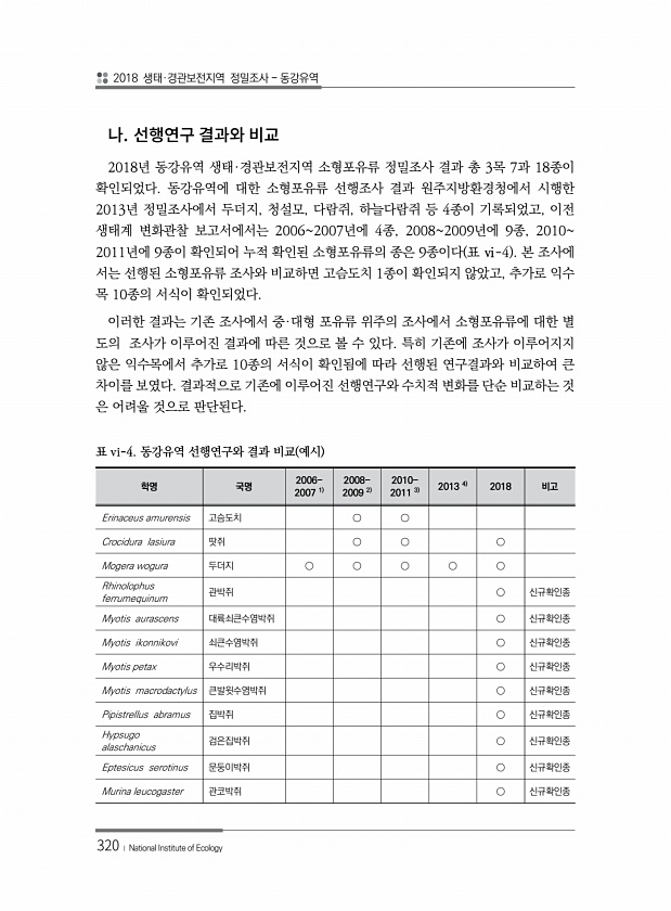 2018 생태·경관보전지역 정밀조사 동강유역 320 ? National Institute of Ecology 2018년 동강유역 생태·경관보전지역 소형포유류 정밀조사 결과 총 3목 7과 18종이 확인되었다. 동강유역에 대한 소형포유류 선행조사 결과 원주지방환경청에서 시행한 2013년 정밀조사에서 두더지, 청설모, 다람쥐, 하늘다람쥐 등 4종이 기록되었고, 이전 생태계 변화관찰 보고서에서는 20062007년에 4종, 20082009년에 9종, 20102011년에 9종이 확인되어 누적 확인된 소형포유류의 종은 9종이다 표 ⅵ-4 본 조사에 서는 선행된 소형포유류 조사와 비교하면 고슴도치 1종이 확인되지 않았고, 추가로 익수 목 10종의 서식이 확인되었다. 이러한 결과는 기존 조사에서 중·대형 포유류 위주의 조사...