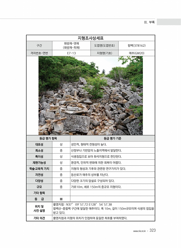 Ⅲ. 부록 www.nie.re.kr ? 323 지형조사상세표 구간 화방재댓재 화방재피재 도엽명 도엽번호 함백 378162 격자번호-연번 E7-13 지형명 기호 애추 GM20 등급 평가 항목 등급 평가 기준 대표성 상 성인적, 형태적 전형성이 높다. 희소성 중 산정부나 기반암의 노출지역에서 발달한다. 특이성 상 식생침입으로 보아 화석지형으로 판단된다. 재현가능성 상 환경적, 인위적 변화에 의한 회복이 어렵다. 학술?교육적 가치 중 지형의 형성과 기후와 관련된 연구가치가 있다. 자연성 중 등산로가 애추의 상부를 지난다. 다양성 중 다양한 크기의 암설로 구성되어 있다. 규모 중 가로10m, 세로 150m의 중규모 지형이다. 기타 항목 등 급 Ⅲ 위치 및 사진 설명 촬영지점 N37° 0957.72 E128° 545...