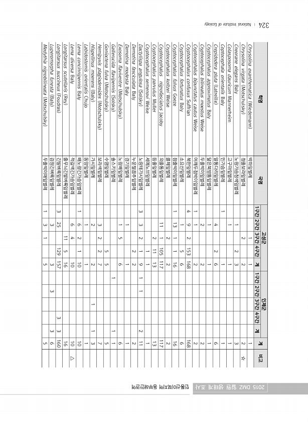 324 학명 국명 고성군 인제군 계 비고 1구간 2구간 3구간 4구간 계 1구간 2구간 3구간 4구간 계 Chrysolina exanthematica Wiedemann 박하잎벌레 1 1 1 Chrysolina virgata Motschulsky 청줄보라잎벌레 2 2 2 ☆ Cneorane elegans Baly 노랑가슴청색잎벌레 1 2 3 3 Colasposoma dauricum Mannerheim 고구마잎벌레 1 1 1 Coptocephala orientalis Baly 민가슴잎벌레 1 1 1 Crepidodera pluta Latreille 알통다리잎벌레 4 2 6 6 Cryptocephalus approximatus Baly 닮은북방통잎벌레 1 1 1 Cryptocephalus bilineatus mo...