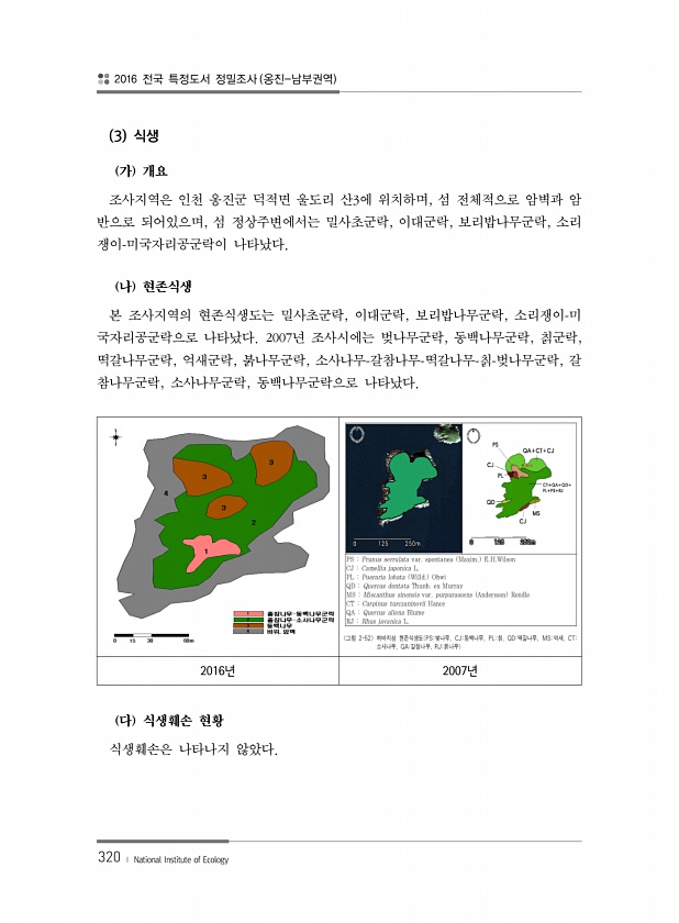 2016 전국 특정도서 정밀조사 옹진-남부권역 320 ? National Institute of Ecology 3 식생 가 개요 조사지역은 인천 옹진군 덕적면 울도리 산3에 위치하며, 섬 전체적으로 암벽과 암 반으로 되어있으며, 섬 정상주변에서는 밀사초군락, 이대군락, 보리밥나무군락, 소리 쟁이-미국자리공군락이 나타났다. 나 현존식생 본 조사지역의 현존식생도는 밀사초군락, 이대군락, 보리밥나무군락, 소리쟁이-미 국자리공군락으로 나타났다. 2007년 조사시에는 벚나무군락, 동백나무군락, 칡군락, 떡갈나무군락, 억새군락, 붉나무군락, 소사나무-갈참나무-떡갈나무-칡-벚나무군락, 갈 참나무군락, 소사나무군락, 동백나무군락으로 나타났다. 2016년 2007년 다 식생훼손 현황 식생훼손은 나타나지않았다.
