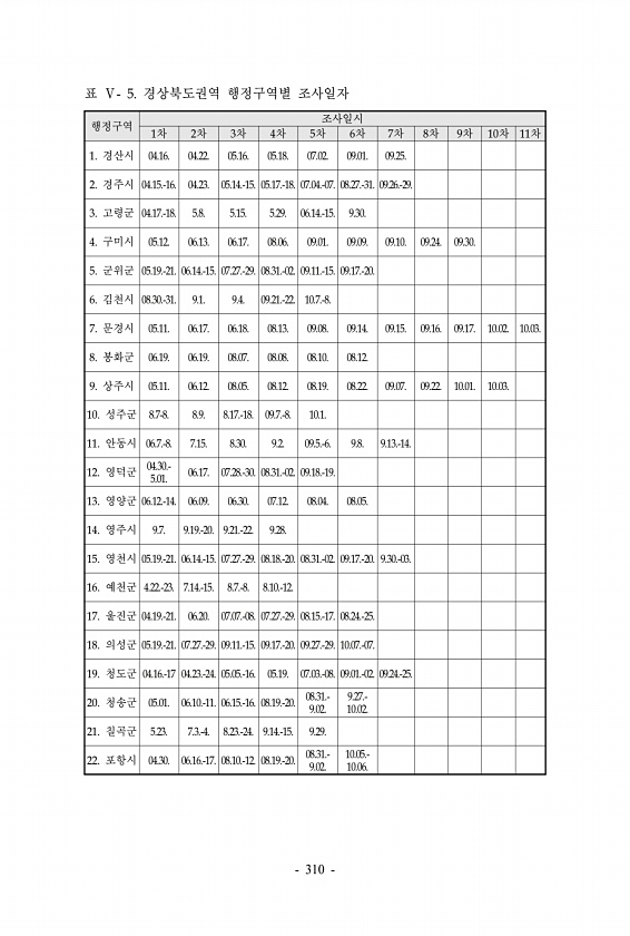 행정구역 조사일시 1차 2차 3차 4차 5차 6차 7차 8차 9차 10차 11차 1. 경산시 04.16. 04.22. 05.16. 05.18. 07.02. 09.01. 09.25. 2. 경주시 04.15.-16. 04.23. 05.14.-15. 05.17.-18. 07.04.-07. 08.27.-31. 09.26.-29. 3. 고령군 04.17.-18. 5.8. 5.15. 5.29. 06.14.-15. 9.30. 4. 구미시 05.12. 06.13. 06.17. 08.06. 09.01. 09.09. 09.10. 09.24. 09.30. 5. 군위군 05.19.-21. 06.14.-15. 07.27.-29. 08.31.-02. 09.11.-15. 09.17.-20. 6. 김천시 08.30.-31. 9.1. 9...