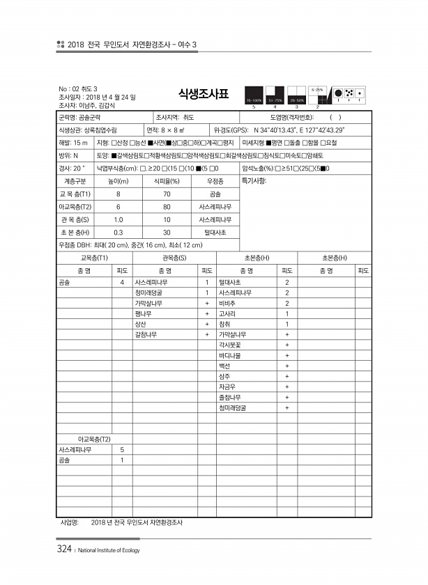 2018 전국 무인도서 자연환경조사 여수 3 324 ? National Institute of Ecology No 02 취도 3 조사일자 2018 년 4 월 24 일 조사자이남주, 김갑식 식생조사표 군락명곰솔군락 조사지역취도 도엽명 격자번호 식생상관상록침엽수림 면적8 × 8 ㎡ 위?경도 GPS N 34°4013.43, E 127°4243.29해발15 m 지형□산정 □능선 ■사면 ■상□중□하 □계곡□평지 미세지형■평면 □돌출 □함몰 □요철 방위N 토양■갈색삼림토□적황색삼림토□암적색삼림토□회갈색삼림토□침식토□미숙토□암쇄토 경사20 ° 낙엽부식층 cm □.≥20 □ 15 □ 10 ■ 5 □0 암석노출 % □≥51□ 25□ 5■0 계층구분 높이 m 식피율 % 우점종 특기사항교 목 층 T1 8 70 곰솔 아교목층 T...