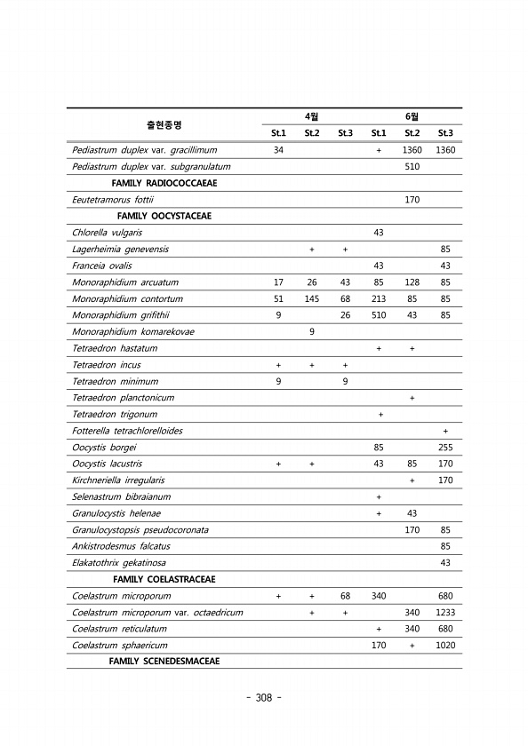 308 출현종명 월4 월6 St.1 St.2 St.3 St.1 St.2 St.3 Pediastrum duplex var. gracillimum 34 + 1360 1360 Pediastrum duplex var. subgranulatum 510 FAMILY RADIOCOCCAEAE Eeutetramorus fottii 170 FAMILY OOCYSTACEAE Chlorella vulgaris 43 Lagerheimia genevensis + + 85 Franceia ovalis 43 43 Monoraphidium arcuatum 17 26 43 85 128 85 Monoraphidium contortum 51 145 68 213 85 85 Monoraphidium grifithii 9 26 510 43 85 ...