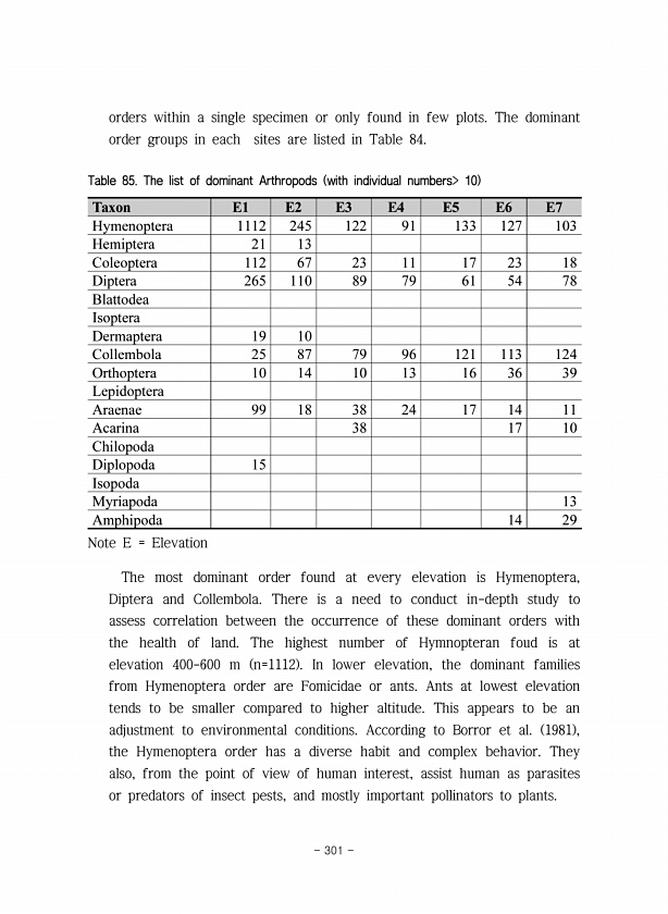 orders within a single specimen or only found in few plots. The dominant order groups in each sites are listed in Table 84. Taxon E1 E2 E3 E4 E5 E6 E7 Hymenoptera 1112 245 122 91 133 127 103 Hemiptera 21 13 Coleoptera 112 67 23 11 17 23 18 Diptera 265 110 89 79 61 54 78 Blattodea Isoptera Dermaptera 19 10 Collembola 25 87 79 96 121 113 124 Orthoptera 10 14 10 13 16 36 39 Lepidoptera Araenae 99 18 ...