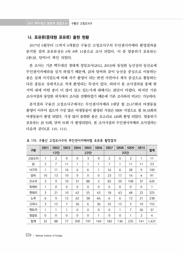 2017 백두대간 생태계 정밀조사 구룡산 고정조사구 326 ? National Institute of Ecology 나. 포유류 중대형 포유류 출현 현황 2017년 6월부터 11까지 6개월간 구룡산 고정조사구의 무인센서카메라 촬영결과를 분석한 결과 포유류상은 6목 8과 11종으로 조사 되었다. 이 중 멸종위기 포유류는 2종 삵, 담비 이 확인 되었다. 본 조사는 기존 백두대간 생태계 정밀조사 2012, 2013 와 동일한 능선상의 등산로에 무인센서카메라를 설치 하였기 때문에, 삵과 담비와 같이 능선을 중심으로 이동하는 종은 실제 서식밀도에 비해 자주 촬영이 되는 반면 사면이나 계곡 중심으로 활동하는 다른 종들은 상대적으로 적게 촬영되는 특성이 있다. 따라서 본 조사결과를 통해 한 지역 내에 어떤 종이 더 많...