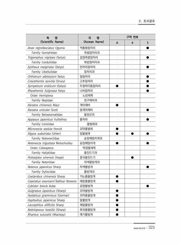 Ⅱ. 조사결과 www.nie.re.kr ? 323 학 명 Scientific Name 국 명 Korean Name 구역 번호 A 4 5 Anax nigrofasciatus Oguma 먹줄왕잠자리 ● Family Gomphidae 측범잠자리과 Trigomphus nigripes Selys 검정측범잠자리 ● Family Corduliidae 북방잠자리과 Epitheca marginata Selys 언저리잠자리 ● Family Libellulidae 잠자리과 Orthetrum albistylum Selys 밀잠자리 ● Crocothemis servilia Drury 고추잠자리 ● Sympetrum eroticum Selys 두점박이좀잠자리 ● ...