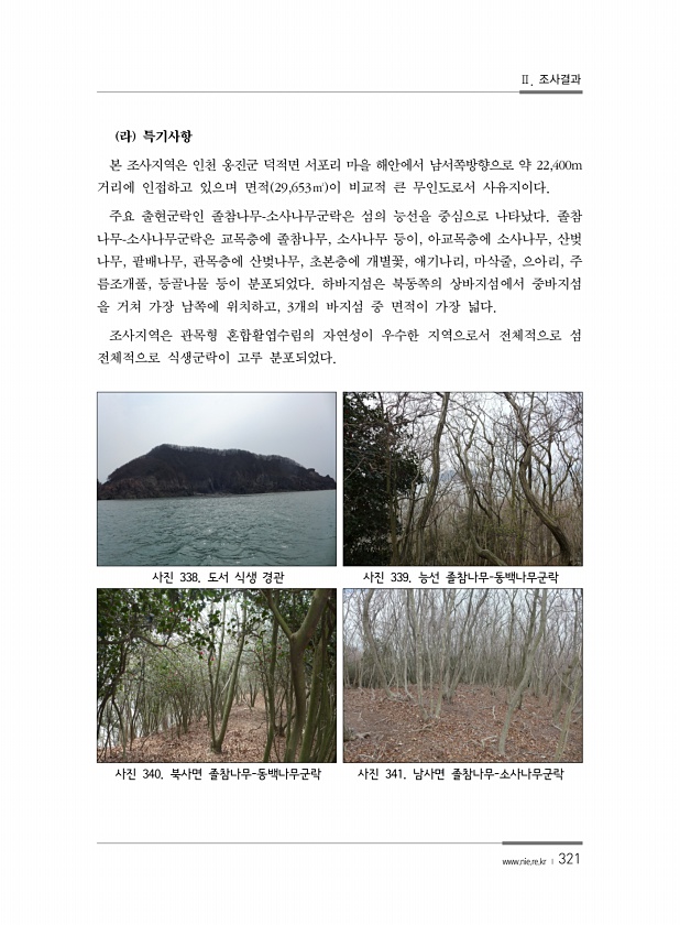 Ⅱ. 조사결과 www.nie.re.kr ? 321 라 특기사항 본 조사지역은 인천 옹진군 덕적면 서포리 마을 해안에서 남서쪽방향으로 약 22,400m 거리에 인접하고 있으며 면적 29,653㎡ 이 비교적 큰 무인도로서 사유지이다. 주요 출현군락인 졸참나무-소사나무군락은 섬의 능선을 중심으로 나타났다. 졸참 나무-소사나무군락은 교목층에 졸참나무, 소사나무 등이, 아교목층에 소사나무, 산벚 나무, 팥배나무, 관목층에 산벚나무, 초본층에 개별꽃, 애기나리, 마삭줄, 으아리, 주 름조개풀, 등골나물 등이 분포되었다. 하바지섬은 북동쪽의 상바지섬에서 중바지섬 을 거쳐 가장 남쪽에 위치하고, 3개의 바지섬 중 면적이 가장 넓다. 조사지역은 관목형 혼합활엽수림의 자연성이 우수한 지역으로서 전체적으로 섬 전체적으로 식생군...