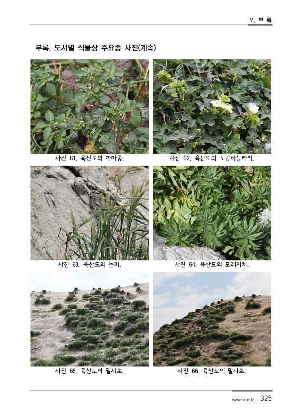 Ⅴ. 부 록 www.nie.re.kr ? 325 부록. 도서별 식물상 주요종 사진 계속 사진 61. 육산도의 까마중. 사진 62. 육산도의 노랑하늘타리. 사진 63. 육산도의 논피. 사진 64. 육산도의 모래지치. 사진 65. 육산도의 밀사초. 사진 66. 육산도의밀사초.
