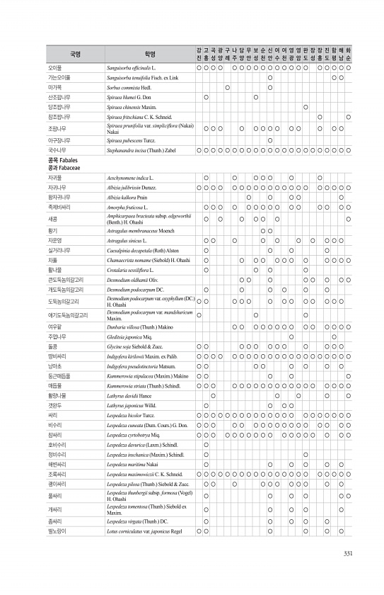 331 오이풀 Sanguisorba offcinalis L. ○ ○ ○ ○ ○ ○ ○ ○ ○ ○ ○ ○ ○ ○ ○ ○ ○ ○ ○ ○ 가는오이풀 Sanguisorba tenuifolia Fisch. ex Link ○ ○ ○ 마가목 Sorbus commixta Hedl. ○ ○ 산조팝나무 Spiraea blumei G. Don ○ ○ 당조팝나무 Spiraea chinensis Maxim. ○ 참조팝나무 Spiraea fritschiana C. K. Schneid. ○ ○ 조팝나무 Spiraea prunifolia var. simplicifora Nakai Nakai ○ ○ ○ ○ ○ ○ ○ ○ ○ ○ ○ ○ ○ 아구장나무 Spiraea pubescens Turcz. ○ 국수나무 Stephanandra incis...