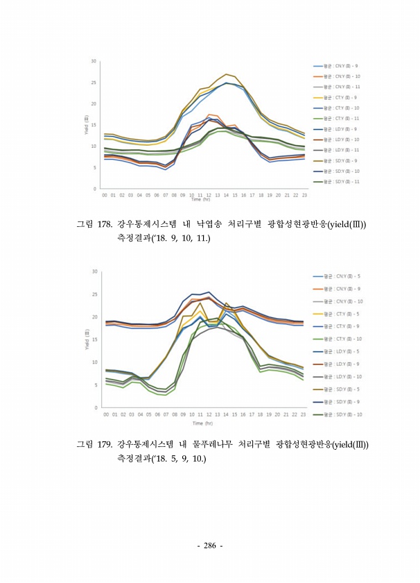 286 그림 178. 강우통제시스템 내 낙엽송 처리구별 광합성현광반응 yield Ⅲ 측정결과 ‘18. 9, 10, 11. 그림 179. 강우통제시스템 내 물푸레나무 처리구별 광합성현광반응 yield Ⅲ 측정결과 ‘18. 5, 9, 10.
