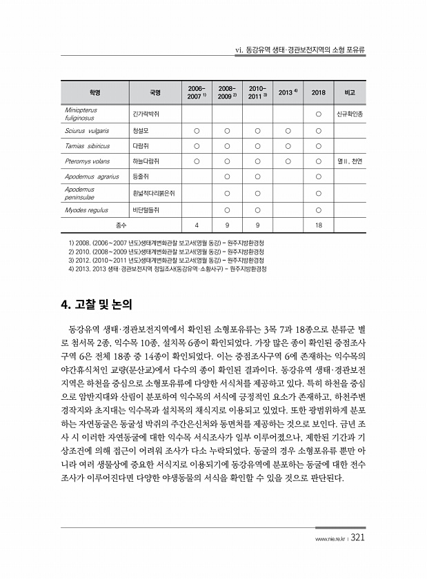 vi. 동강유역 생태·경관보전지역의 소형 포유류 www.nie.re.kr ?321 1 2008. 2006∼2007 년도 생태계변화관찰 보고서 영월 동강 ? 원주지방환경청 2 2010. 2008∼2009 년도 생태계변화관찰 보고서 영월 동강 ? 원주지방환경청 3 2012. 2010∼2011 년도 생태계변화관찰 보고서 영월 동강 ? 원주지방환경청 4 2013. 2013 생태·경관보전지역 정밀조사 동강유역·소황사구 원주지방환경청 4. 동강유역 생태·경관보전지역에서 확인된 소형포유류는 3목 7과 18종으로 분류군 별 로 첨서목 2종, 익수목 10종, 설치목 6종이 확인되었다. 가장 많은 종이 확인된 중점조사 구역 6은 전체 18종 중 14종이 확인되었다. 이는 중점조사구역 6에 존재하는 익수목의 야간휴식처인 교량 ...