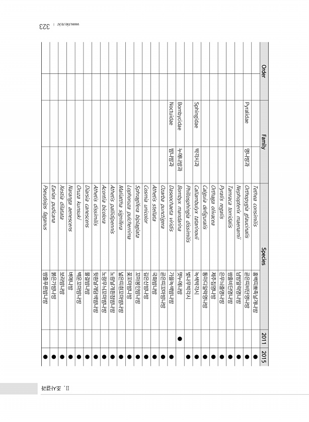 323 Order Family Species 2011 2015 Tethea consimilis 홍백띠뾰족날개나방 ● Pyralidae 명나방과 Orthopygia glaucinalis 곧은띠비단명나방 ● Nephopterix maenamii 남방알락명나방 ● Tamraca torridalis 쌍줄비단명나방 ● Pyralis regalis 은무늬줄명나방 ● Orthaga olivacea 제주집명나방 ● Calguia defiguralis 통마디알락명나방 ● Sphingidae 박각시과 Callambulyx tatarinovii 녹색박각시 ● Phillosphingia dissimilis 벚나무박각시 ● Bombycidae 누에나방과 Bombyx mandarina 멧누에나방 ● Noctuidae 밤나방과 Das...